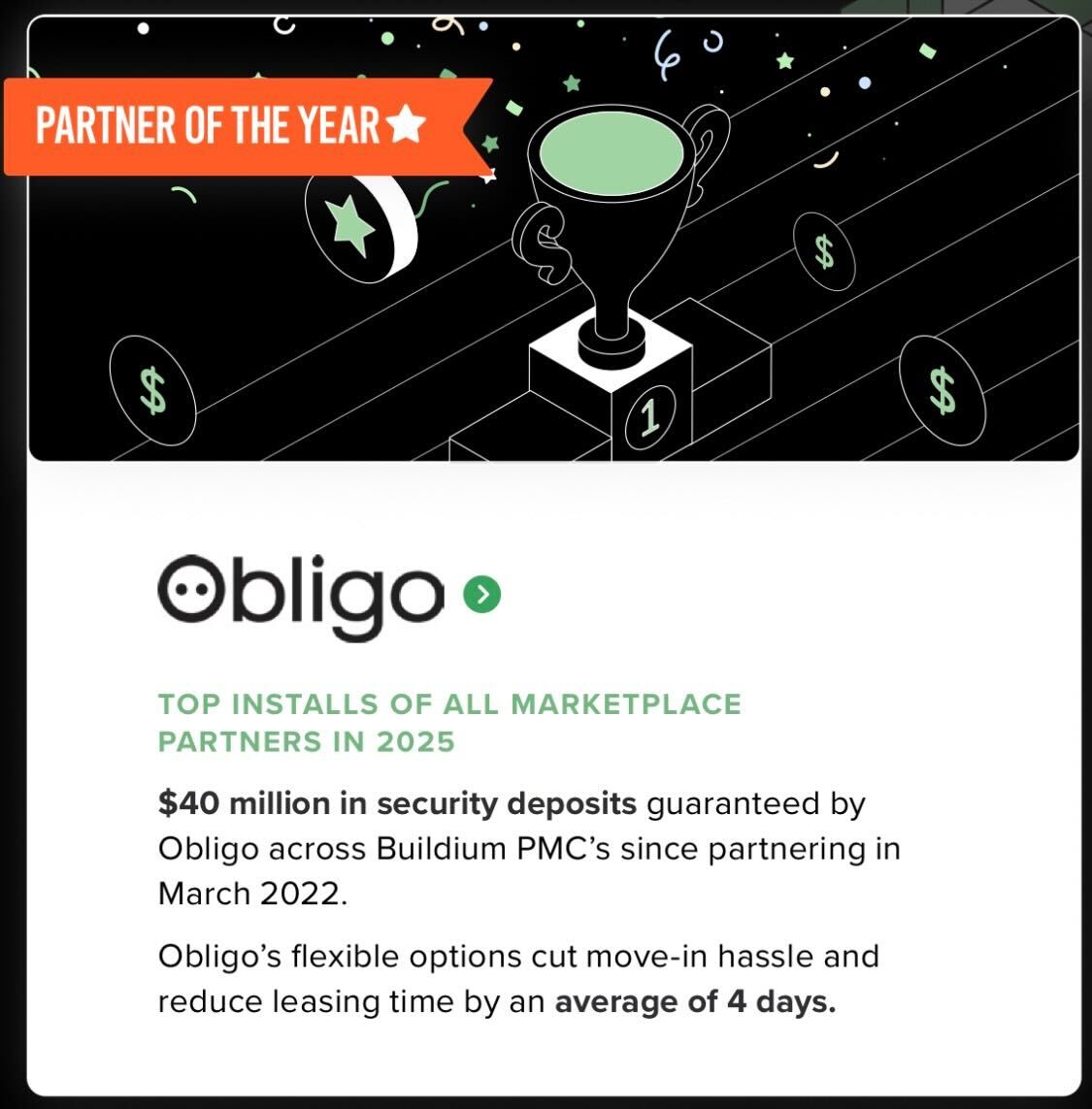 In November, we announced our partnership with RealPage, bringing our deposit solutions directly into OneSite workflows. The experience makes it even easier to streamline leasing, improve resident satisfaction, and eliminate deposit headaches. As RealPage sunsetted its Deposit Insurance offering, Obligo stepped in as their preferred deposit solution, giving RealPage users access to its flexible alternative that integrate smoothly into existing workflows. This strengthened partnership not only streamlines operations for property teams but also delivers a clearer, more modern move-in experience for renters, solidifying Obligo’s role as the trusted deposit solution within one of the industry's most influential ecosystems.